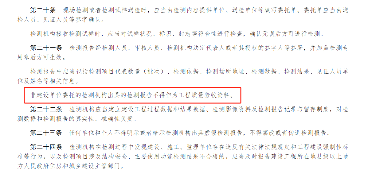 中華人民共和國住房和城鄉(xiāng)建設(shè)部發(fā)布的《建設(shè)工程質(zhì)量檢測管理辦法》第二十一條明確非建設(shè)單位委托的檢測機(jī)構(gòu)出具的檢測報(bào)告不得作為工程質(zhì)量驗(yàn)收資料。