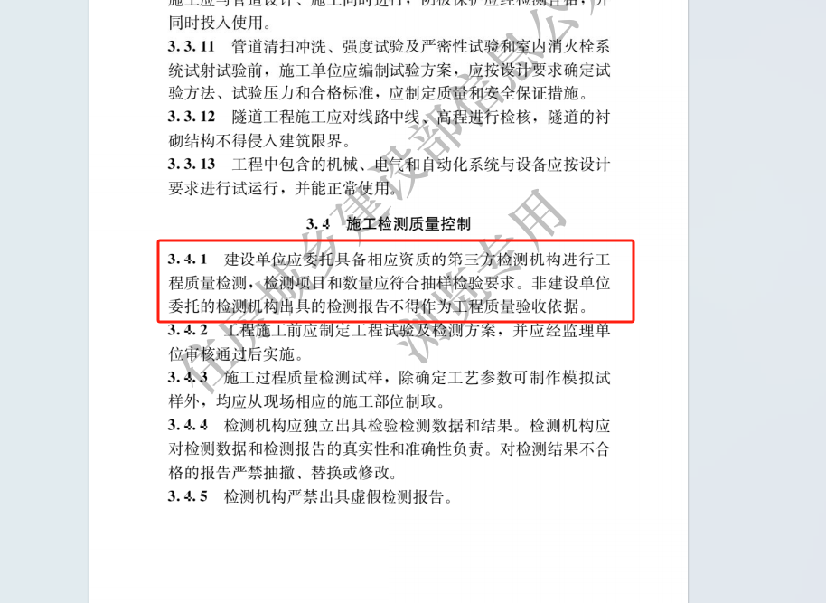 住房和城鄉(xiāng)建設(shè)部關(guān)于發(fā)布國家標(biāo)準(zhǔn)《建筑與市政工程施工質(zhì)量控制通用規(guī)范》的3.4.1 建設(shè)單位應(yīng)委托具備相應(yīng)資質(zhì)的第三方檢測機(jī)構(gòu)進(jìn)行工程質(zhì)量檢測,檢測項(xiàng)目和數(shù)量應(yīng)符合抽樣檢驗(yàn)要求。非建設(shè)單位委托的檢測機(jī)構(gòu)出具的檢測報(bào)告不得作為工程質(zhì)量驗(yàn)收依據(jù)。