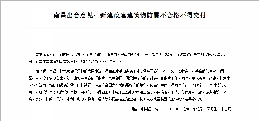南昌出臺意見:新建改建建筑物防雷不合格不得交付